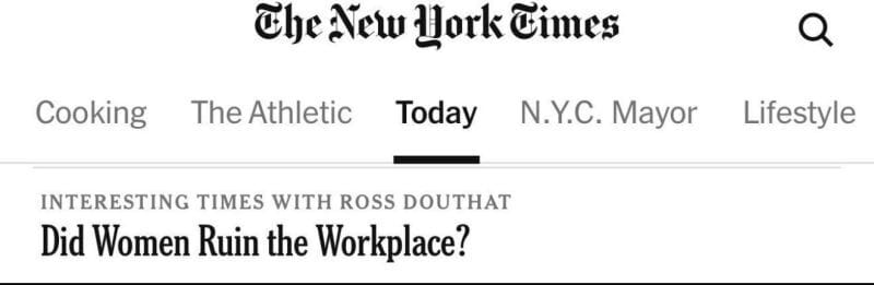 The headline caused significant backlash and was subsequently changed to variations such as "Did Liberal Feminism Ruin the Workplace?" and "Have 'Feminine Vices' Taken Over the Workplace?". The piece was written by conservative columnist Ross Douthat and featured a discussion with two other conservative writers.